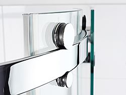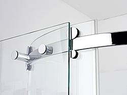 Markante Einheit: Kugelgelagerte Laufrollen mit Aushebesicherung in Verbindung mit robuster Laufschiene garantieren sanftes Gleiten der 8 mm starken Türen hinter die Festteile.
